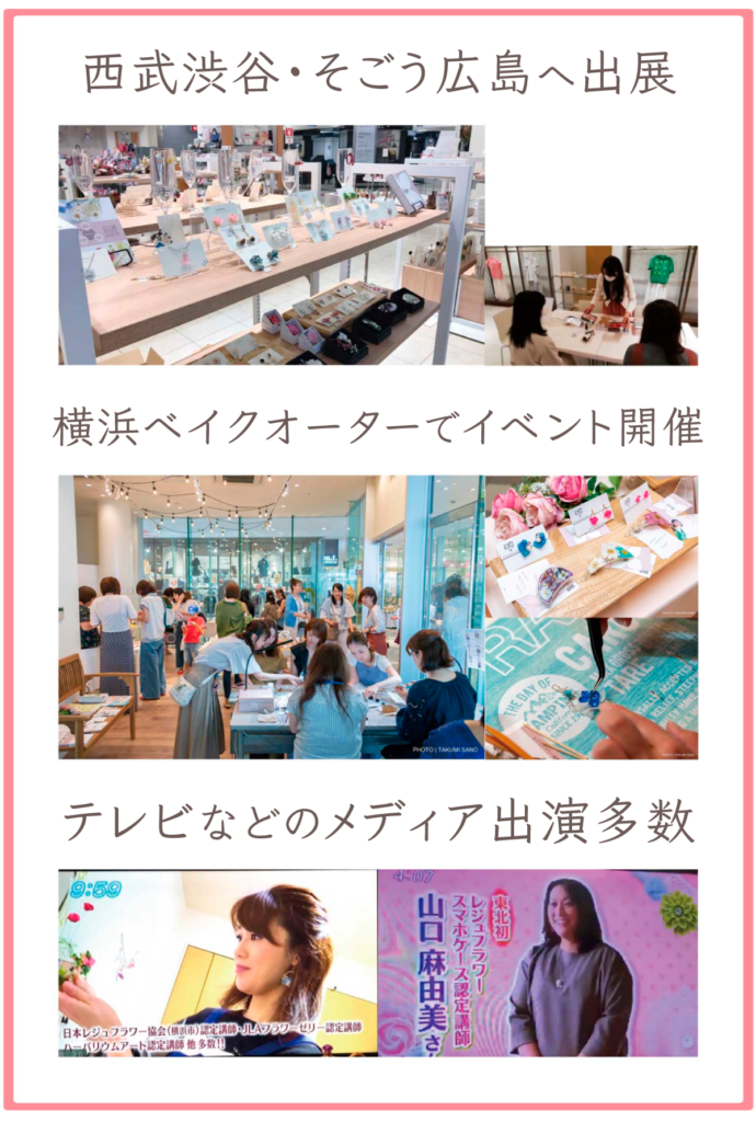 本物の花とレジンアクセサリーを組み合わせた教室を主宰し、北海道、大阪など首都圏以外の地域をはじめ、海外からも受講生が集まる。